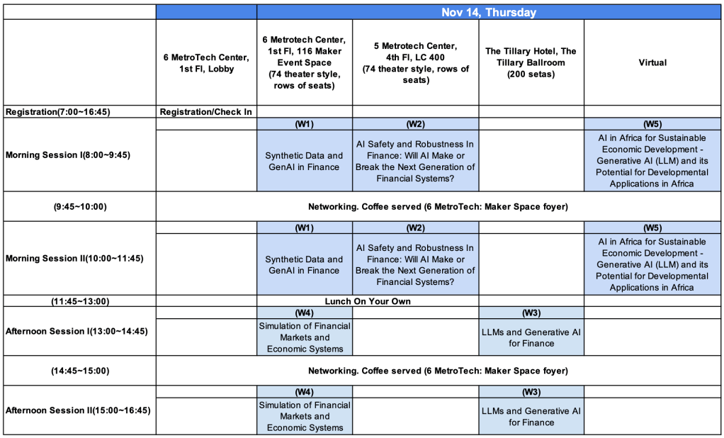 | LLMs and Generative AI for Finance (in-person only) | Nov 14th, Afternoon | See Details |